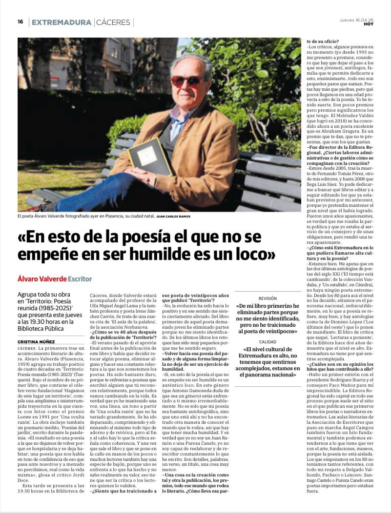 Con esta declaración de intenciones escrita en el umbral de su nuevo libro, Álvaro Valverde nos invita a adentrarnos, a través de su mirada personal, al panorama poético extremeño contemporáneo.